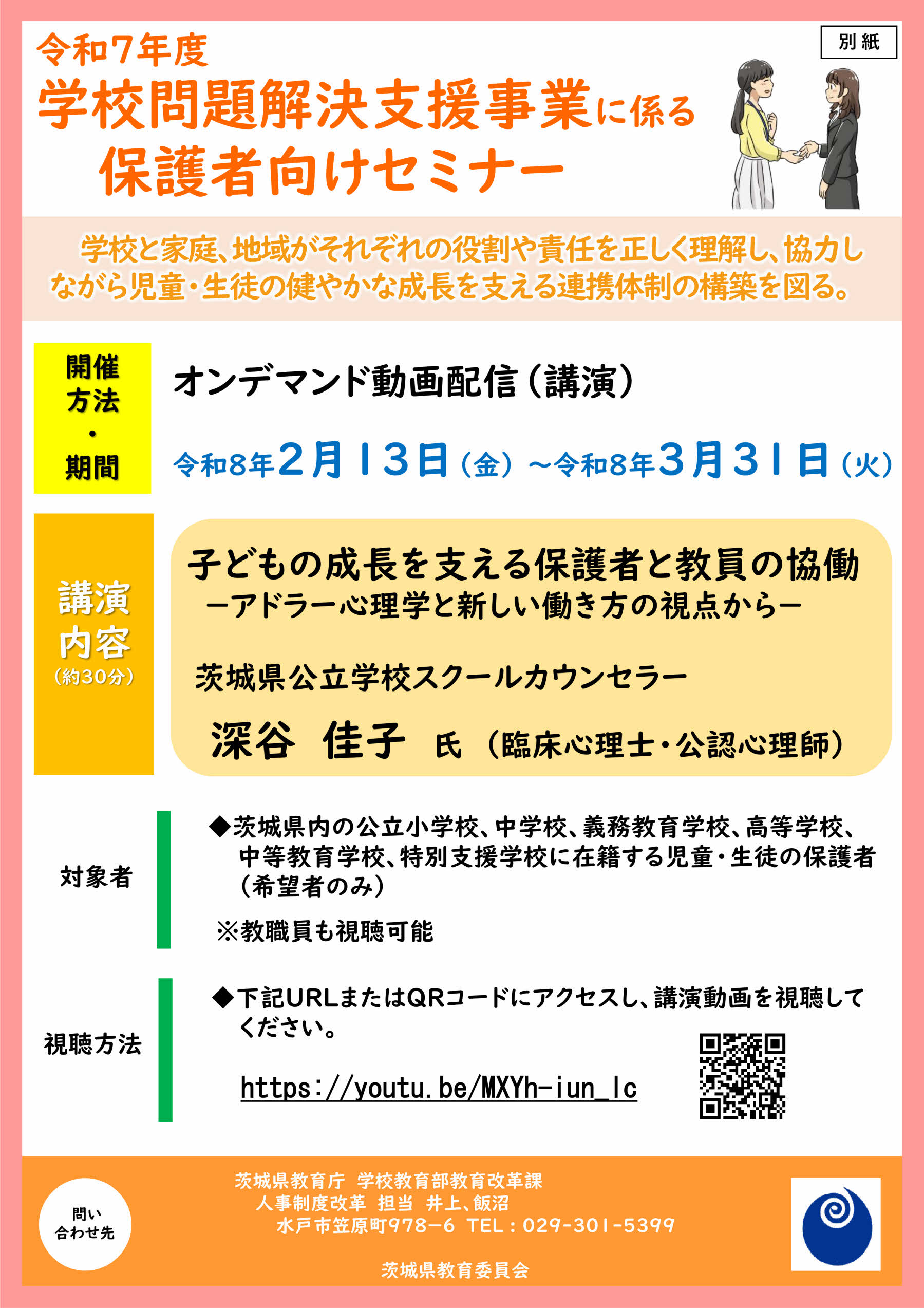 茨城県教育委員会より「令和7年度学校問題解決支援事業に係る保護者向けセミナー」について案内が来ております。下記URLにアクセスし、講演動画を視聴してください。